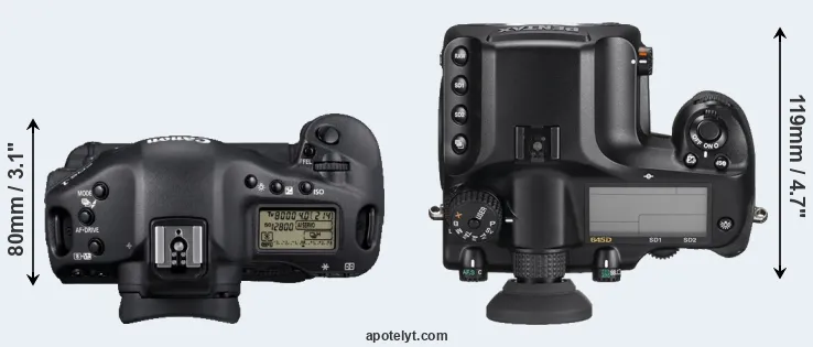 The physical size and weight of the Canon 1D Mark IV and the Pentax 645D are illustrated in the side-by-side display below. The two cameras are presented according to their relative size. Three successive views from the front, the top, and the rear are shown. All width, height and depth measures are rounded to the nearest millimeter.