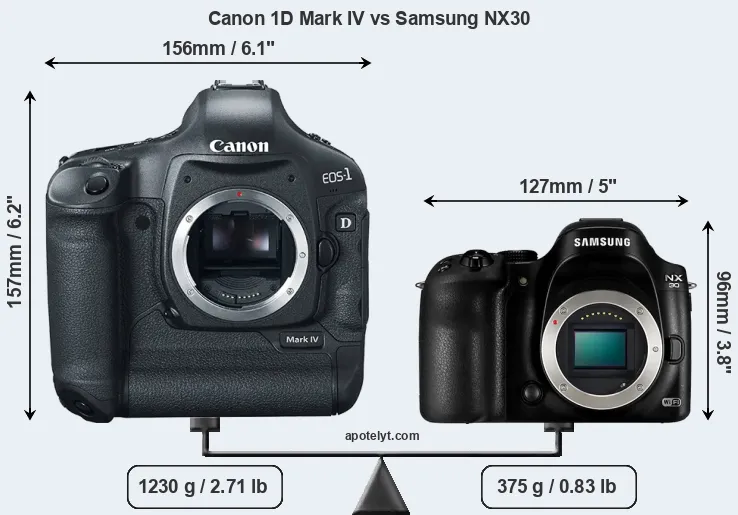 If the front view area (width x height) of the cameras is taken as an aggregate measure of their size, the Samsung NX30 is considerably smaller (50 percent) than the Canon 1D Mark IV. Moreover, the NX30 is substantially lighter (70 percent) than the 1D Mark IV. It is worth mentioning in this context that the 1D Mark IV is splash and dust resistant, while the NX30 does not feature any corresponding weather-sealing.