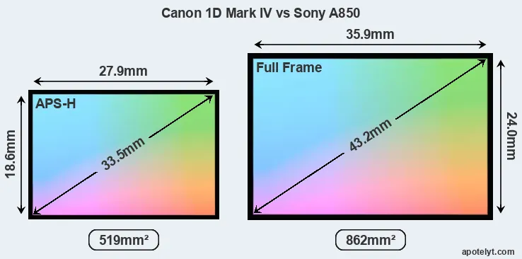 Of the two cameras under consideration, the Canon 1D Mark IV features an APS-H sensor and the Sony A850 a full frame sensor. The sensor area in the A850 is 66 percent bigger. As a result of these sensor size differences, the cameras have a format factor of, respectively, 1.3 and 1.0. Both cameras have a native aspect ratio (sensor width to sensor height) of 3:2.