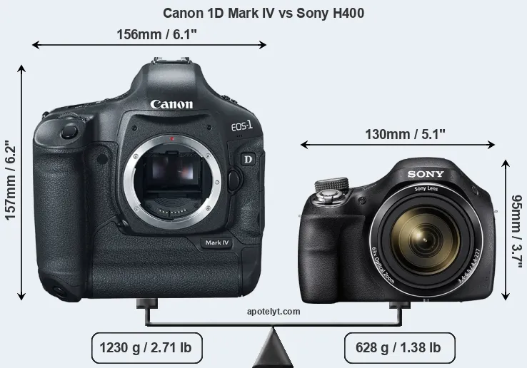 If the front view area (width x height) of the cameras is taken as an aggregate measure of their size, the Sony H400 is considerably smaller (50 percent) than the Canon 1D Mark IV. It is worth mentioning in this context that the 1D Mark IV is splash and dust resistant, while the H400 does not feature any corresponding weather-sealing.