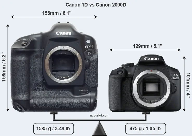 The side-by-side display below illustrates the physical size and weight of the Canon 1D and the Canon 2000D. The two cameras are presented according to their relative size. Three consecutive views from the front, the top, and the rear side are shown. All size dimensions are rounded to the nearest millimeter.