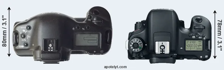 The side-by-side display below illustrates the physical size and weight of the Canon 1D and the Canon 760D. The two cameras are presented according to their relative size. Three consecutive views from the front, the top, and the rear side are shown. All size dimensions are rounded to the nearest millimeter.