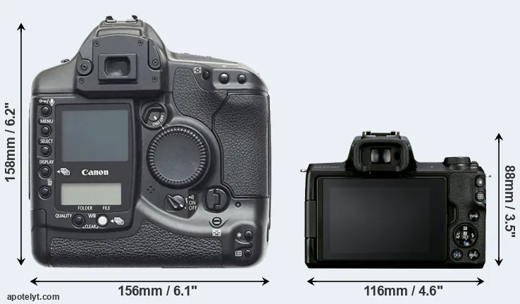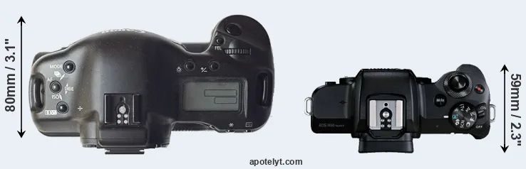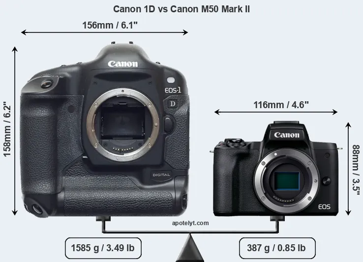The side-by-side display below illustrates the physical size and weight of the Canon 1D and the Canon M50 Mark II. The two cameras are presented according to their relative size. Three successive views from the front, the top, and the rear are shown. All width, height and depth dimensions are rounded to the nearest millimeter.