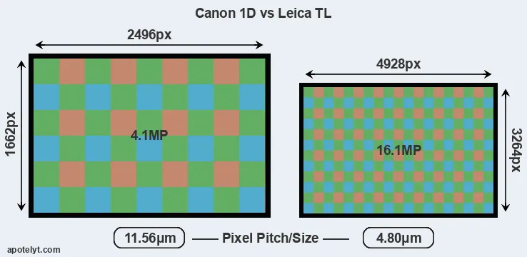 Despite having a smaller sensor, the TL offers a higher resolution of 16.1 megapixels, compared with 4.1 MP of the 1D. This megapixels advantage comes at the cost of a higher pixel density and a smaller size of the individual pixel (with a pixel pitch of 4.80μm versus 11.56μm for the 1D). However, it should be noted that the TL is much more recent (by 15 years and 1 month) than the 1D, and its sensor will have benefitted from technological advances during this time that make it possible to gather light more efficiently. Coming back to sensor resolution, it should be mentioned that the TL has no anti-alias filter installed, so that it can capture all the detail its sensor resolves.