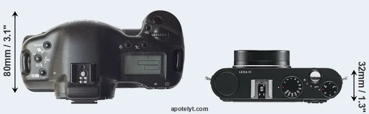 An illustration of the physical size and weight of the Canon 1D and the Leica X1 is provided in the side-by-side display below. The two cameras are presented according to their relative size. Three consecutive views from the front, the top, and the rear side are shown. All width, height and depth dimensions are rounded to the nearest millimeter.