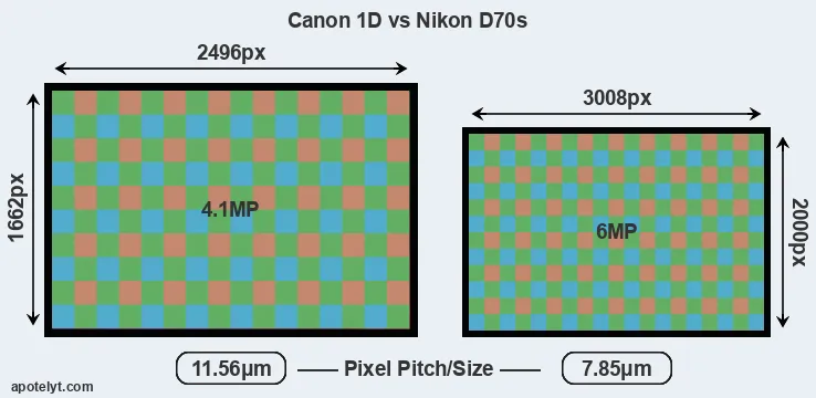 Despite having a smaller sensor, the D70s offers a higher resolution of 6 megapixels, compared with 4.1 MP of the 1D. This megapixels advantage comes at the cost of a higher pixel density and a smaller size of the individual pixel (with a pixel pitch of 7.85μm versus 11.56μm for the 1D). However, it should be noted that the D70s is much more recent (by 3 years and 6 months) than the 1D, and its sensor will have benefitted from technological advances during this time that make it possible to gather light more efficiently.
