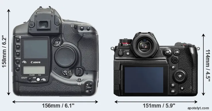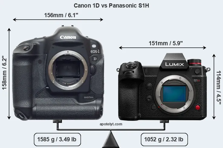 The side-by-side display below illustrates the physical size and weight of the Canon 1D and the Panasonic S1H. The two cameras are presented according to their relative size. Three successive views from the front, the top, and the rear are shown. All width, height and depth measures are rounded to the nearest millimeter.