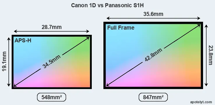 Of the two cameras under consideration, the Canon 1D features an APS-H sensor and the Panasonic S1H a full frame sensor. The sensor area in the S1H is 55 percent bigger. As a result of these sensor size differences, the cameras have a format factor of, respectively, 1.3 and 1.0. Both cameras have a native aspect ratio (sensor width to sensor height) of 3:2.