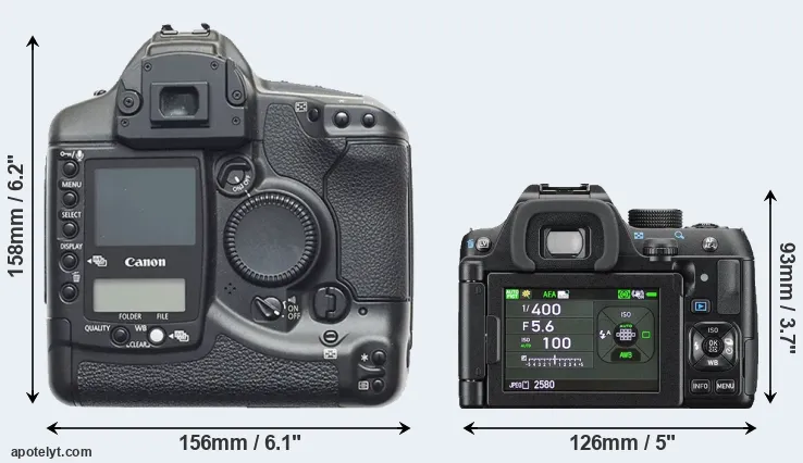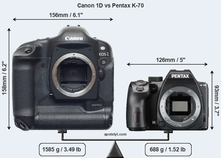 The physical size and weight of the Canon 1D and the Pentax K-70 are illustrated in the side-by-side display below. The two cameras are presented according to their relative size. Three consecutive views from the front, the top, and the rear side are shown. All size dimensions are rounded to the nearest millimeter.