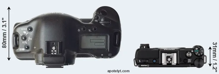 The physical size and weight of the Canon 1D and the Pentax Q are illustrated in the side-by-side display below. The two cameras are presented according to their relative size. Three successive views from the front, the top, and the rear are shown. All width, height and depth dimensions are rounded to the nearest millimeter.