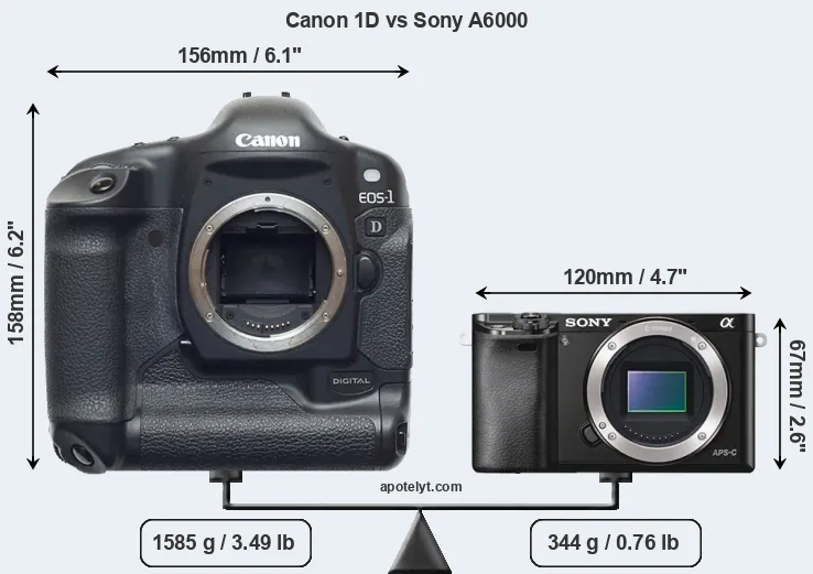 The side-by-side display below illustrates the physical size and weight of the Canon 1D and the Sony A6000. The two cameras are presented according to their relative size. Three consecutive views from the front, the top, and the rear side are shown. All width, height and depth dimensions are rounded to the nearest millimeter.