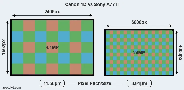 Despite having a smaller sensor, the A77 II offers a higher resolution of 24 megapixels, compared with 4.1 MP of the 1D. This megapixels advantage comes at the cost of a higher pixel density and a smaller size of the individual pixel (with a pixel pitch of 3.91μm versus 11.56μm for the 1D). However, it should be noted that the A77 II is much more recent (by 12 years and 7 months) than the 1D, and its sensor will have benefitted from technological advances during this time that make it possible to gather light more efficiently.