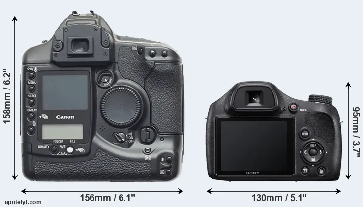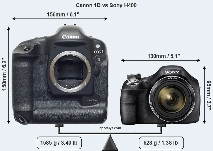 If the front view area (width x height) of the cameras is taken as an aggregate measure of their size, the Sony H400 is considerably smaller (50 percent) than the Canon 1D. It is worth mentioning in this context that the 1D is splash and dust resistant, while the H400 does not feature any corresponding weather-sealing.