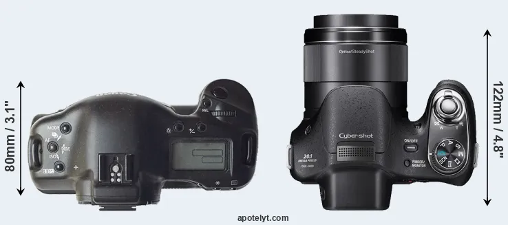 The physical size and weight of the Canon 1D and the Sony H400 are illustrated in the side-by-side display below. The two cameras are presented according to their relative size. Three consecutive views from the front, the top, and the rear side are shown. All size dimensions are rounded to the nearest millimeter.