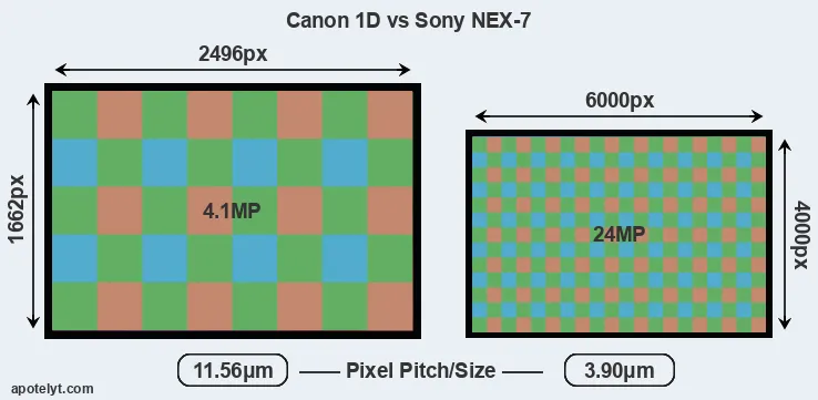 Despite having a smaller sensor, the NEX-7 offers a higher resolution of 24 megapixels, compared with 4.1 MP of the 1D. This megapixels advantage comes at the cost of a higher pixel density and a smaller size of the individual pixel (with a pixel pitch of 3.90μm versus 11.56μm for the 1D). However, it should be noted that the NEX-7 is much more recent (by 9 years and 11 months) than the 1D, and its sensor will have benefitted from technological advances during this time that make it possible to gather light more efficiently.