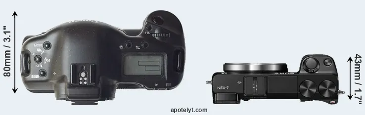 The side-by-side display below illustrates the physical size and weight of the Canon 1D and the Sony NEX-7. The two cameras are presented according to their relative size. Three consecutive views from the front, the top, and the rear side are shown. All width, height and depth dimensions are rounded to the nearest millimeter.