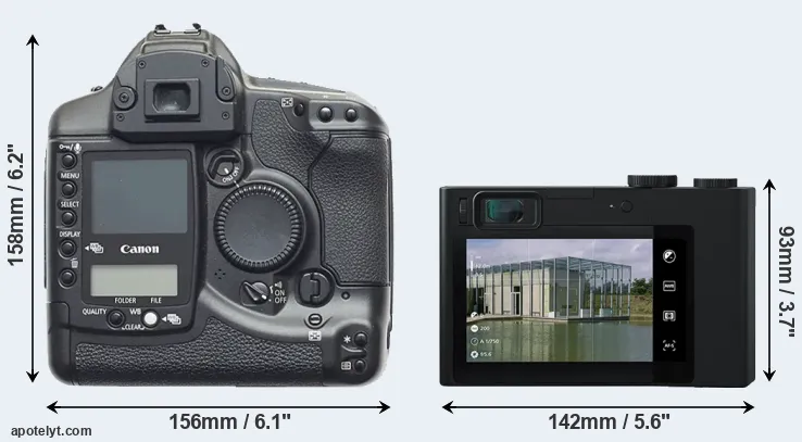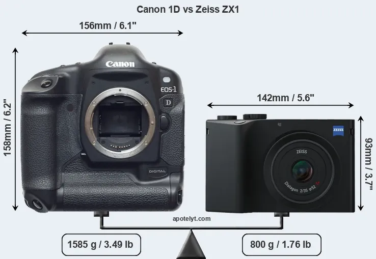 The physical size and weight of the Canon 1D and the Zeiss ZX1 are illustrated in the side-by-side display below. The two cameras are presented according to their relative size. Three consecutive perspectives from the front, the top, and the back are available. All width, height and depth dimensions are rounded to the nearest millimeter.