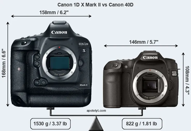 The above size and weight comparisons are to some extent incomplete since they do not consider the interchangeable lenses that both of these cameras require. A larger imaging sensor (as in the 1DX Mark II) will tend to go along with bigger and heavier lenses, while more compact options are available for the smaller-sensor camera (40D). You can compare the optics available in the Canon EF Lens Catalog.