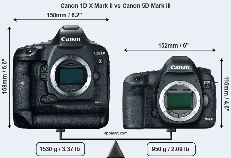 An illustration of the physical size and weight of the Canon 1D X Mark II and the Canon 5D Mark III is provided in the side-by-side display below. The two cameras are presented according to their relative size. Three consecutive views from the front, the top, and the rear side are shown. All size dimensions are rounded to the nearest millimeter.