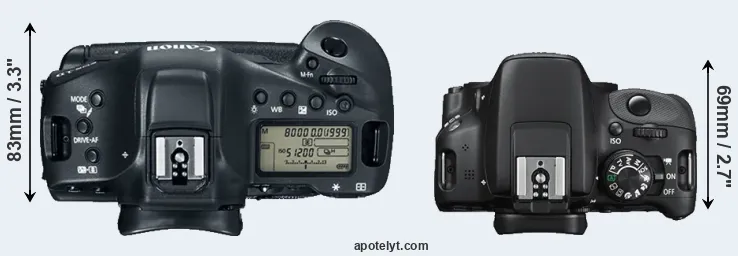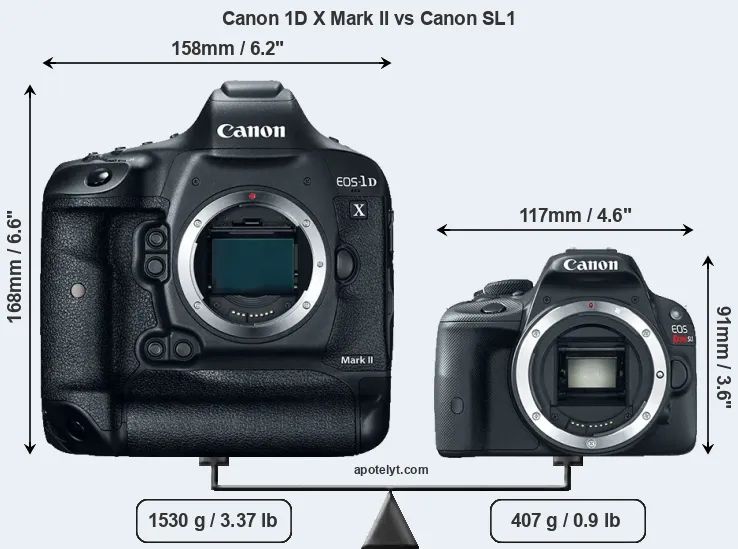 The side-by-side display below illustrates the physical size and weight of the Canon 1D X Mark II and the Canon SL1. The two cameras are presented according to their relative size. Three consecutive perspectives from the front, the top, and the back are available. All size dimensions are rounded to the nearest millimeter.