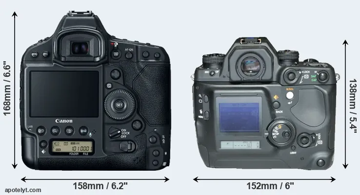 | 5. | Canon 1D X | 158 mm | 168 mm | 83 mm | 1551 g | 1120 | Y | Oct 2011 | US$ 6 799 | ebay.com | |