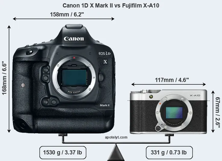 An illustration of the physical size and weight of the Canon 1D X Mark II and the Fujifilm X-A10 is provided in the side-by-side display below. The two cameras are presented according to their relative size. Three successive views from the front, the top, and the rear are shown. All size dimensions are rounded to the nearest millimeter.