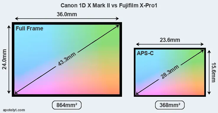 Of the two cameras under consideration, the Canon 1D X Mark II features a full frame sensor and the Fujifilm X-Pro1 an APS-C sensor. The sensor area in the X-Pro1 is 57 percent smaller. As a result of these sensor size differences, the cameras have a format factor of, respectively, 1.0 and 1.5. Both cameras have a native aspect ratio (sensor width to sensor height) of 3:2.