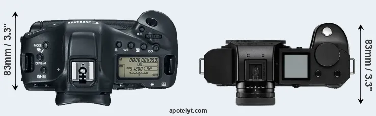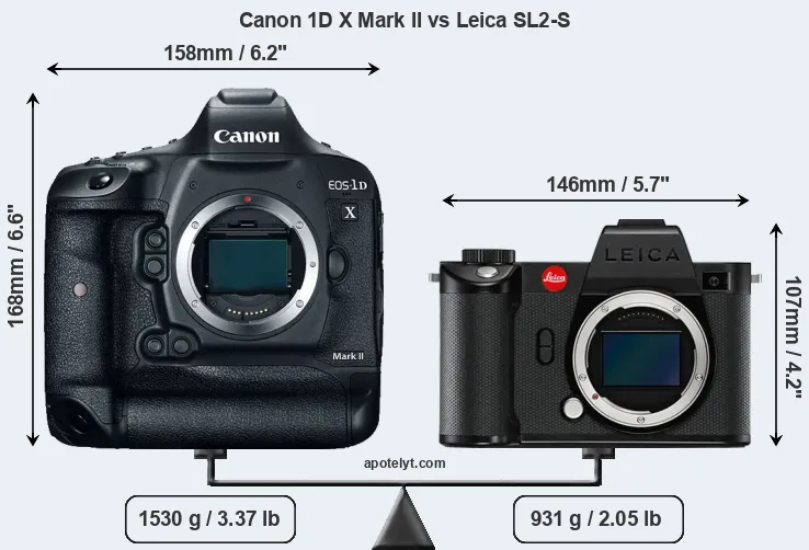 The side-by-side display below illustrates the physical size and weight of the Canon 1D X Mark II and the Leica SL2-S. The two cameras are presented according to their relative size. Three consecutive perspectives from the front, the top, and the back are available. All width, height and depth measures are rounded to the nearest millimeter.