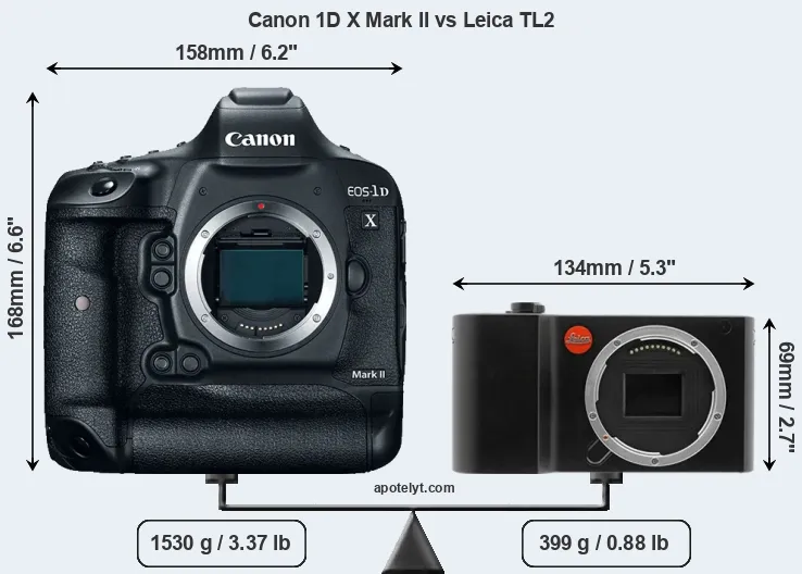 An illustration of the physical size and weight of the Canon 1D X Mark II and the Leica TL2 is provided in the side-by-side display below. The two cameras are presented according to their relative size. Three consecutive views from the front, the top, and the rear side are shown. All width, height and depth measures are rounded to the nearest millimeter.