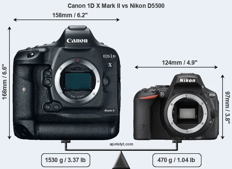 If the front view area (width x height) of the cameras is taken as an aggregate measure of their size, the Nikon D5500 is considerably smaller (55 percent) than the Canon 1D X Mark II. Moreover, the D5500 is substantially lighter (69 percent) than the 1DX Mark II. It is worth mentioning in this context that the 1DX Mark II is splash and dust resistant, while the D5500 does not feature any corresponding weather-sealing.