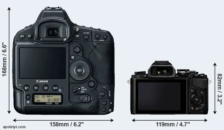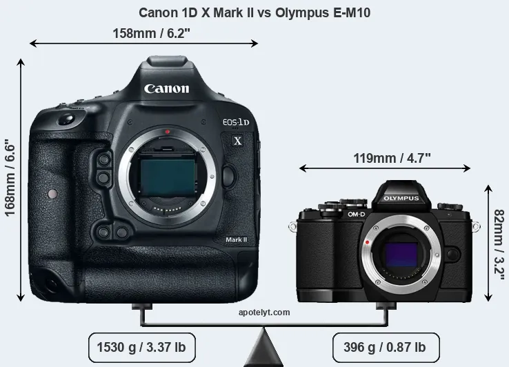 The physical size and weight of the Canon 1D X Mark II and the Olympus E-M10 are illustrated in the side-by-side display below. The two cameras are presented according to their relative size. Three consecutive views from the front, the top, and the rear side are shown. All width, height and depth dimensions are rounded to the nearest millimeter.