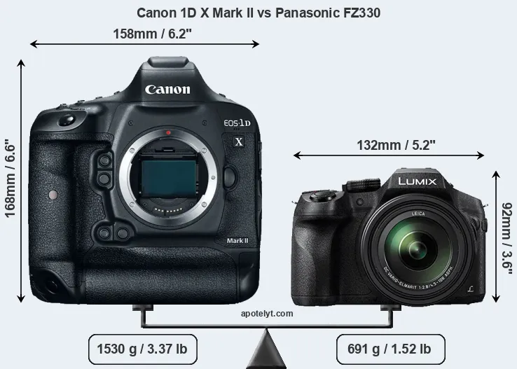 The side-by-side display below illustrates the physical size and weight of the Canon 1D X Mark II and the Panasonic FZ330. The two cameras are presented according to their relative size. Three consecutive views from the front, the top, and the rear side are shown. All width, height and depth dimensions are rounded to the nearest millimeter.
