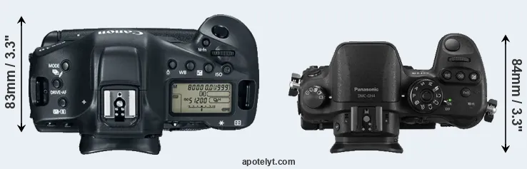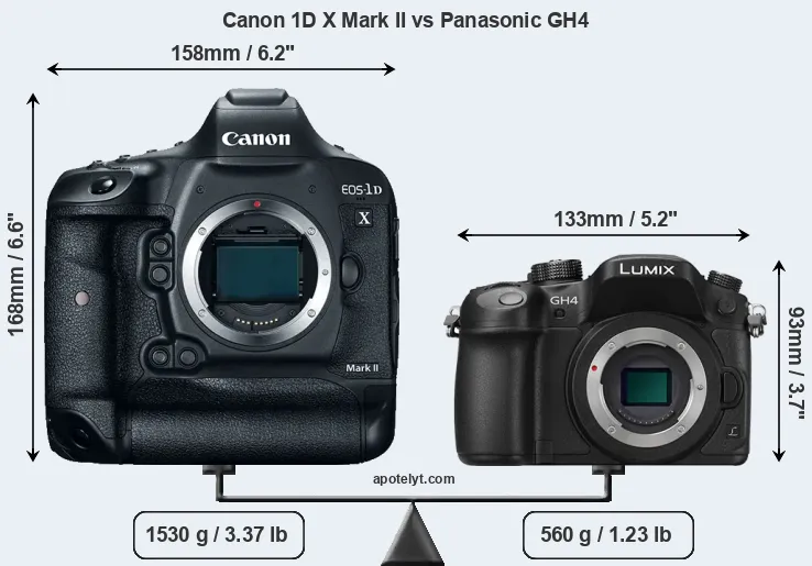 An illustration of the physical size and weight of the Canon 1D X Mark II and the Panasonic GH4 is provided in the side-by-side display below. The two cameras are presented according to their relative size. Three consecutive perspectives from the front, the top, and the back are available. All width, height and depth measures are rounded to the nearest millimeter.