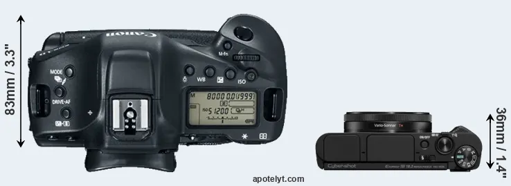 The side-by-side display below illustrates the physical size and weight of the Canon 1D X Mark II and the Sony HX99. The two cameras are presented according to their relative size. Three consecutive perspectives from the front, the top, and the back are available. All size dimensions are rounded to the nearest millimeter.