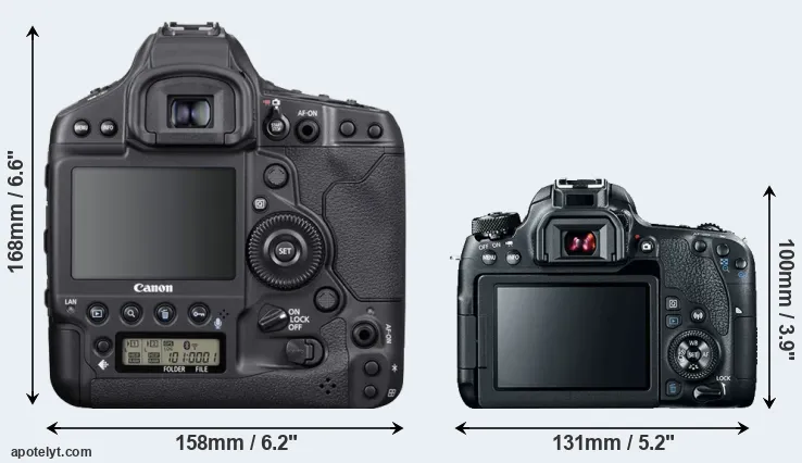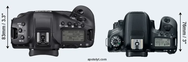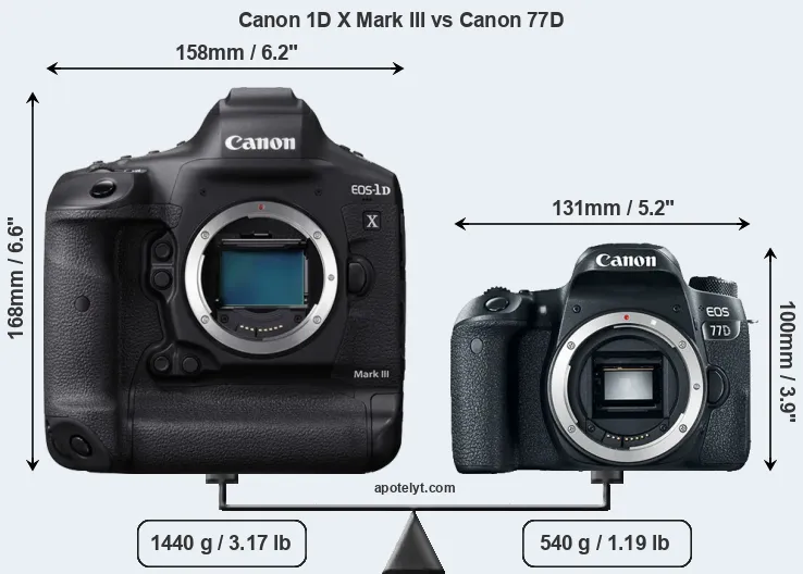The physical size and weight of the Canon 1D X Mark III and the Canon 77D are illustrated in the side-by-side display below. The two cameras are presented according to their relative size. Three consecutive perspectives from the front, the top, and the back are available. All width, height and depth dimensions are rounded to the nearest millimeter.