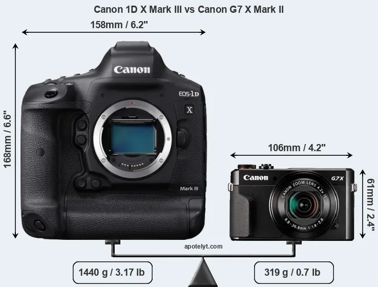 If the front view area (width x height) of the cameras is taken as an aggregate measure of their size, the Canon G7 X Mark II is considerably smaller (76 percent) than the Canon 1D X Mark III. It is worth mentioning in this context that the 1DX Mark III is splash and dust resistant, while the G7X Mark II does not feature any corresponding weather-sealing.