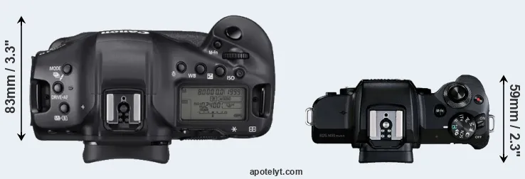 An illustration of the physical size and weight of the Canon 1D X Mark III and the Canon M50 Mark II is provided in the side-by-side display below. The two cameras are presented according to their relative size. Three successive views from the front, the top, and the rear are shown. All width, height and depth measures are rounded to the nearest millimeter.