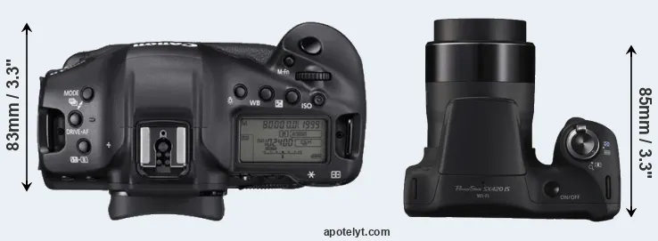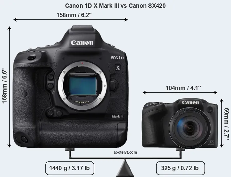 The side-by-side display below illustrates the physical size and weight of the Canon 1D X Mark III and the Canon SX420. The two cameras are presented according to their relative size. Three consecutive perspectives from the front, the top, and the back are available. All width, height and depth measures are rounded to the nearest millimeter.