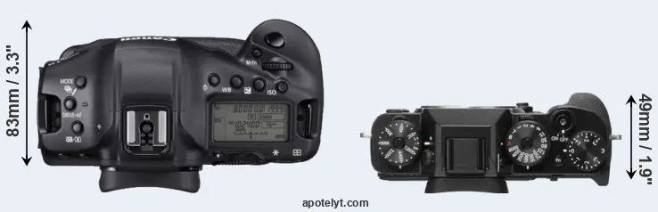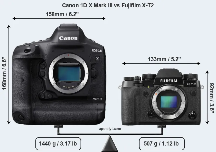 An illustration of the physical size and weight of the Canon 1D X Mark III and the Fujifilm X-T2 is provided in the side-by-side display below. The two cameras are presented according to their relative size. Three consecutive perspectives from the front, the top, and the back are available. All size dimensions are rounded to the nearest millimeter.