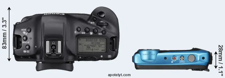 The above size and weight comparisons are to some extent incomplete and possibly misleading, as the XP140 has a lens built in, whereas the 1DX Mark III is an interchangeable lens camera that requires a separate lens. Attaching the latter will add extra weight and bulk to the setup. You can compare the optics available for the 1DX Mark III and their specifications in the Canon EF Lens Catalog.