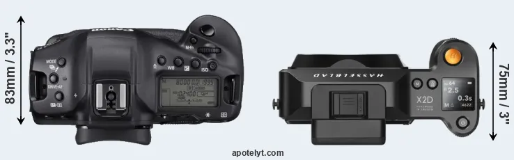 The physical size and weight of the Canon 1D X Mark III and the Hasselblad X2D 100C are illustrated in the side-by-side display below. The two cameras are presented according to their relative size. Three successive views from the front, the top, and the rear are shown. All width, height and depth dimensions are rounded to the nearest millimeter.
