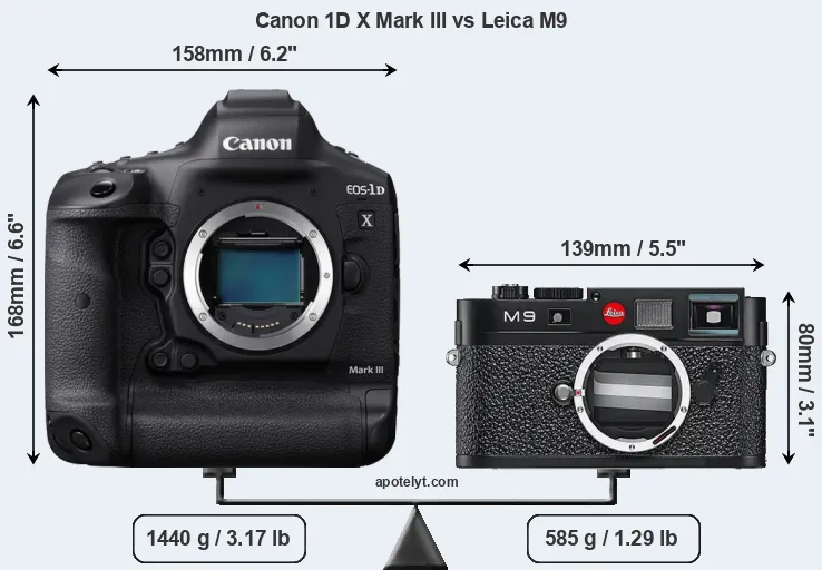 The physical size and weight of the Canon 1D X Mark III and the Leica M9 are illustrated in the side-by-side display below. The two cameras are presented according to their relative size. Three successive views from the front, the top, and the rear are shown. All width, height and depth measures are rounded to the nearest millimeter.