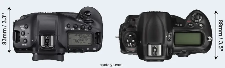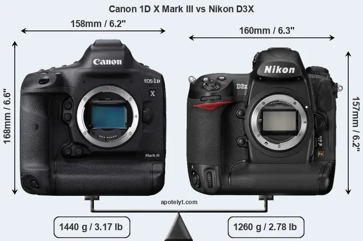 The physical size and weight of the Canon 1D X Mark III and the Nikon D3X are illustrated in the side-by-side display below. The two cameras are presented according to their relative size. Three consecutive perspectives from the front, the top, and the back are available. All width, height and depth dimensions are rounded to the nearest millimeter.