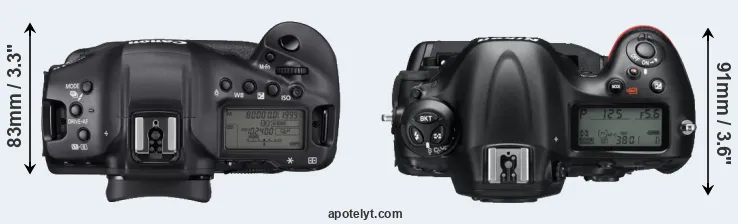 The physical size and weight of the Canon 1D X Mark III and the Nikon D4 are illustrated in the side-by-side display below. The two cameras are presented according to their relative size. Three consecutive views from the front, the top, and the rear side are shown. All size dimensions are rounded to the nearest millimeter.