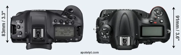 The physical size and weight of the Canon 1D X Mark III and the Nikon D4S are illustrated in the side-by-side display below. The two cameras are presented according to their relative size. Three consecutive views from the front, the top, and the rear side are shown. All size dimensions are rounded to the nearest millimeter.