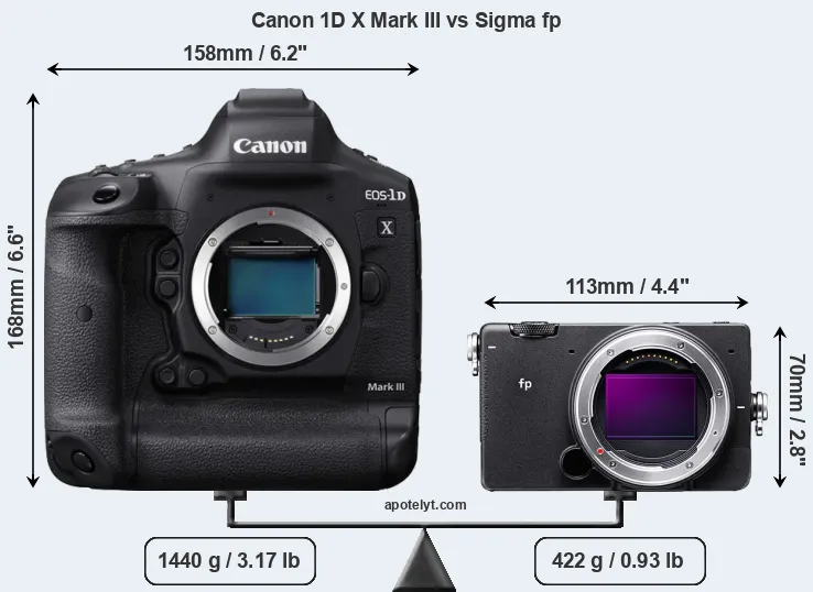 The side-by-side display below illustrates the physical size and weight of the Canon 1D X Mark III and the Sigma fp. The two cameras are presented according to their relative size. Three consecutive perspectives from the front, the top, and the back are available. All width, height and depth measures are rounded to the nearest millimeter.