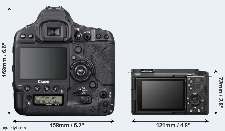 The side-by-side display below illustrates the physical size and weight of the Canon 1D X Mark III and the Sony ZV-E1. The two cameras are presented according to their relative size. Three consecutive perspectives from the front, the top, and the back are available. All width, height and depth measures are rounded to the nearest millimeter.