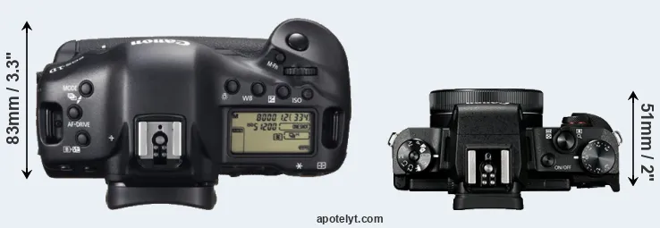 The side-by-side display below illustrates the physical size and weight of the Canon 1D X and the Canon G1 X Mark III. The two cameras are presented according to their relative size. Three consecutive views from the front, the top, and the rear side are shown. All width, height and depth dimensions are rounded to the nearest millimeter.