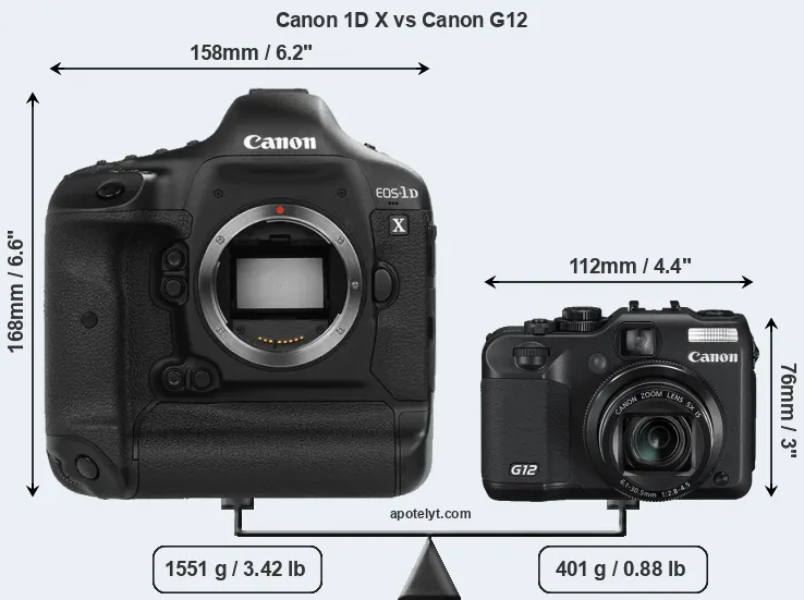 An illustration of the physical size and weight of the Canon 1D X and the Canon G12 is provided in the side-by-side display below. The two cameras are presented according to their relative size. Three successive views from the front, the top, and the rear are shown. All width, height and depth measures are rounded to the nearest millimeter.