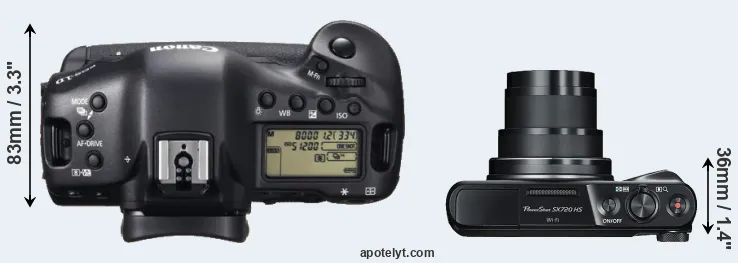 If the front view area (width x height) of the cameras is taken as an aggregate measure of their size, the Canon SX720 is considerably smaller (73 percent) than the Canon 1D X. It is worth mentioning in this context that the 1DX is splash and dust resistant, while the SX720 does not feature any corresponding weather-sealing.